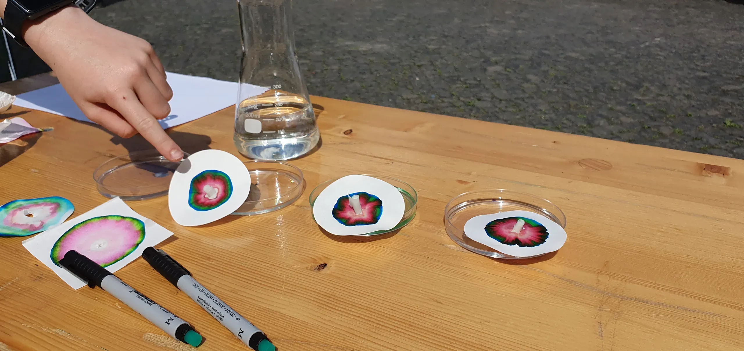 Um Kinder und Jugendliche jeden Alters abzuholen, waren die Versuche bereits für die Kleinsten mitgedacht. Diese hatten viel Spaß beim Ausmalen des Farbkreisels mit Farben, die sie eigenständig aus den Primärfarben hergestellt haben. Mit den größeren Kindern konnte im Anschluss der Chromatographie-Versuch durchgeführt werden und Jung und Alt begeistern. Hierzu wurde ein schwarzer, nicht wasserfester Filzstift mit Hilfe von Filterpapier und Wasser in seine einzelnen Bestandteile aufgetrennt. Die engagierten Großelter konnten anschließend mit Tipps für weitere Haushaltsmittel-Versuche mit ihren Enkelkindern zum Thema Licht und Farbe versorgt werden.
